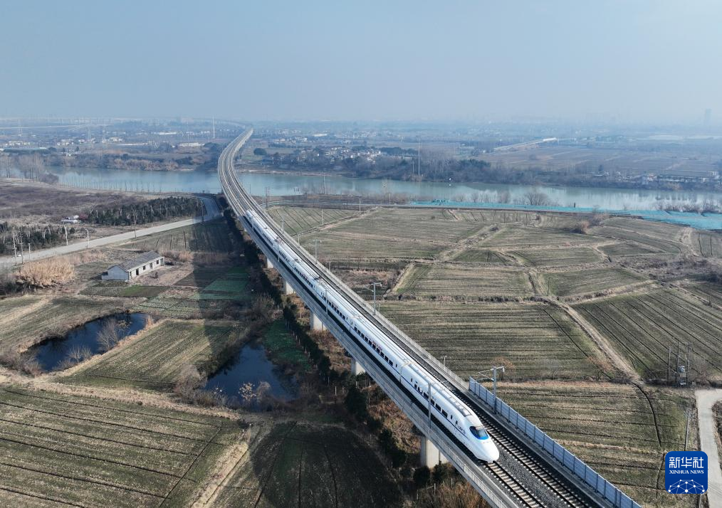 1月9日,一列高铁列车行驶在安徽省巢湖市境内(无人机照片)。新华社发(马丰成 摄)