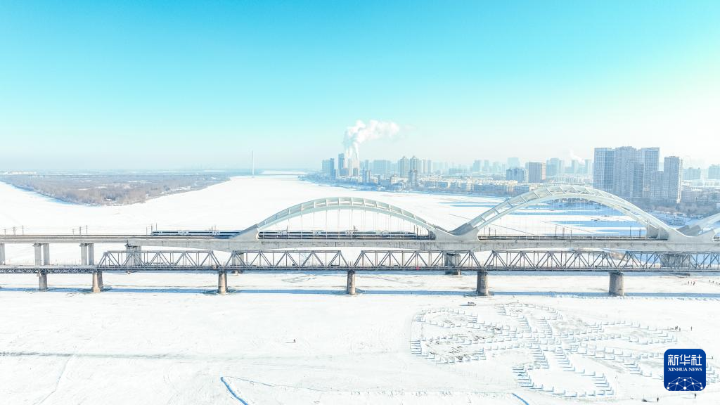 1月9日,动车组列车行驶在黑龙江哈尔滨松花江铁路大桥上(无人机照片)。新华社发(原勇摄)