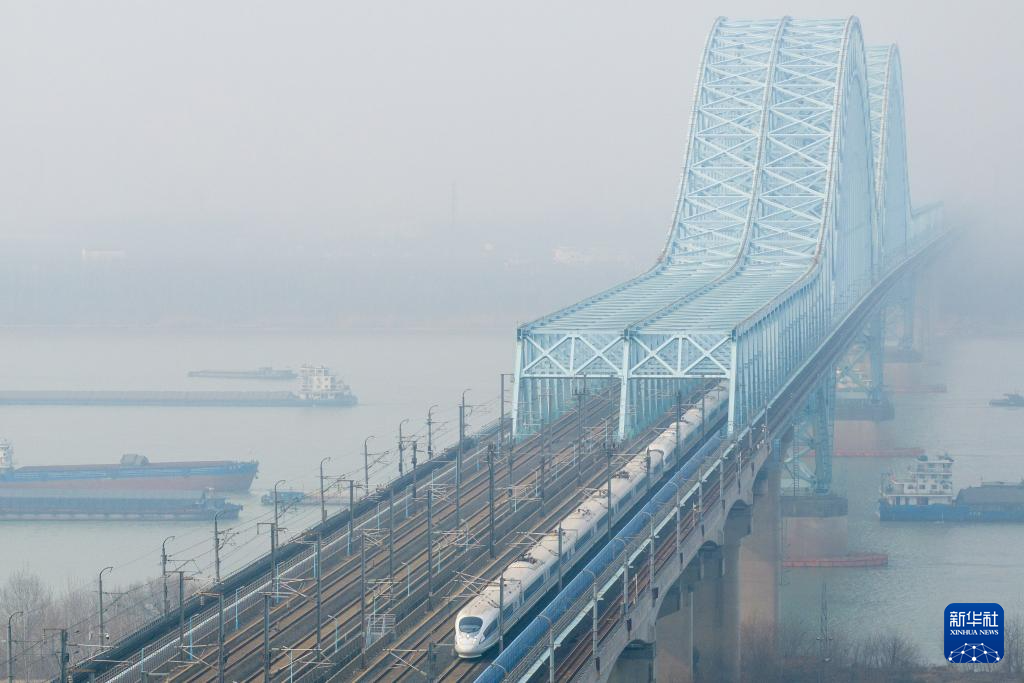1月9日,动车组列车驶经江苏南京大胜关长江大桥(无人机照片)。新华社发(方东旭摄)