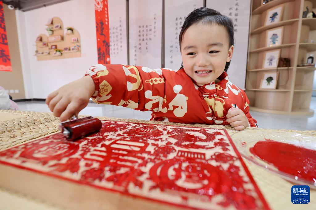 1月13日,在浙江省湖州市德清县舞阳街道上柏村柏阅书房,小朋友在非遗迎新春活动中体验传统木版年画拓印技艺。新华社发(谢尚国 摄)