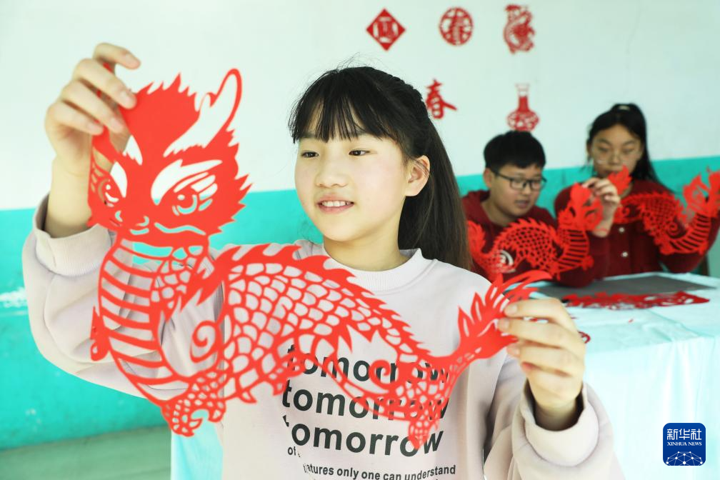 1月12日,河北省唐山市丰润区大漫港小学学生在展示自己的龙年主题剪纸作品。新华社发(朱大勇 摄)