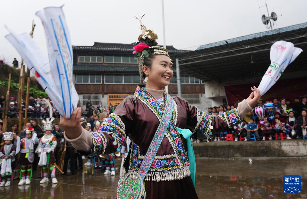 1月11日,在广西柳州市融水苗族自治县杆洞乡锦洞村,苗家女载歌载舞。当日是农历腊月初一,当地迎来一年一度的苗年节。新华社发 (龙涛 摄)