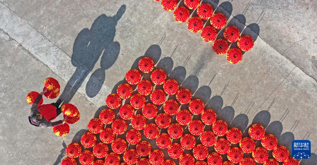 1月13日,浙江省台州市仙居县横溪镇的灯笼加工厂,员工在晾晒制作好的红灯笼(无人机照片)。新华社发(王华斌 摄)