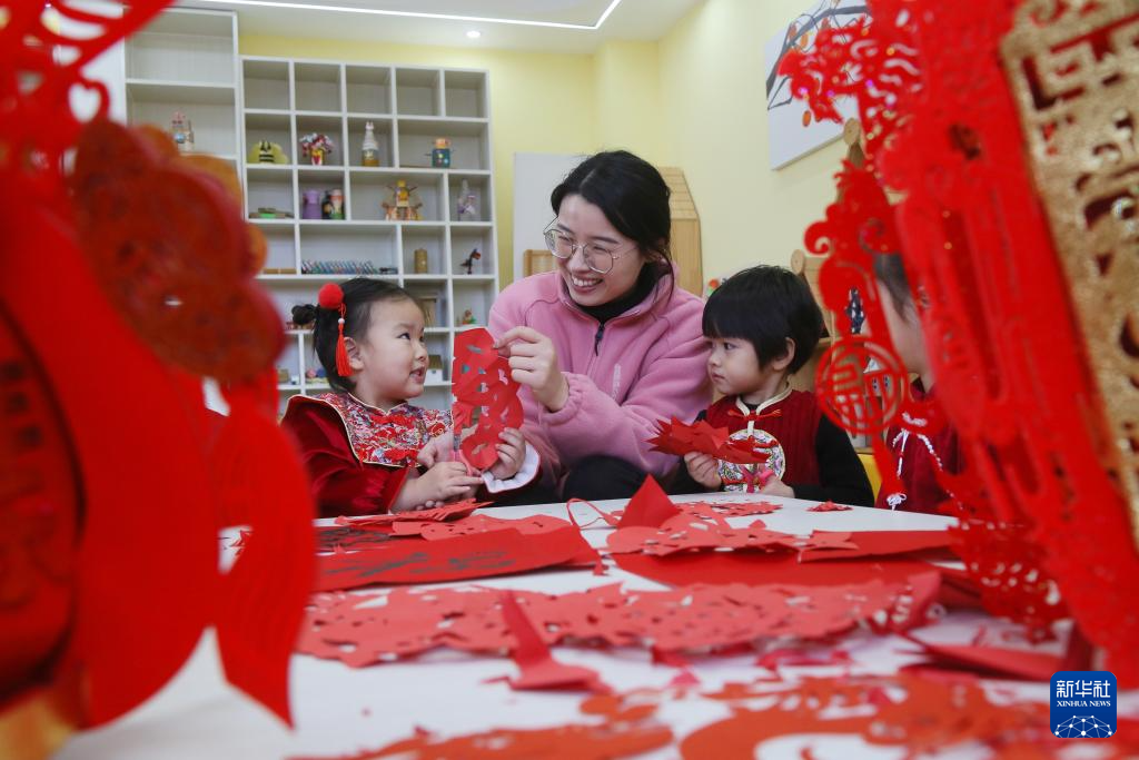 1月12日,河北省邢台市平乡县县直第三幼儿园的老师和小朋友一起剪窗花。新华社发(范钦龙 摄)