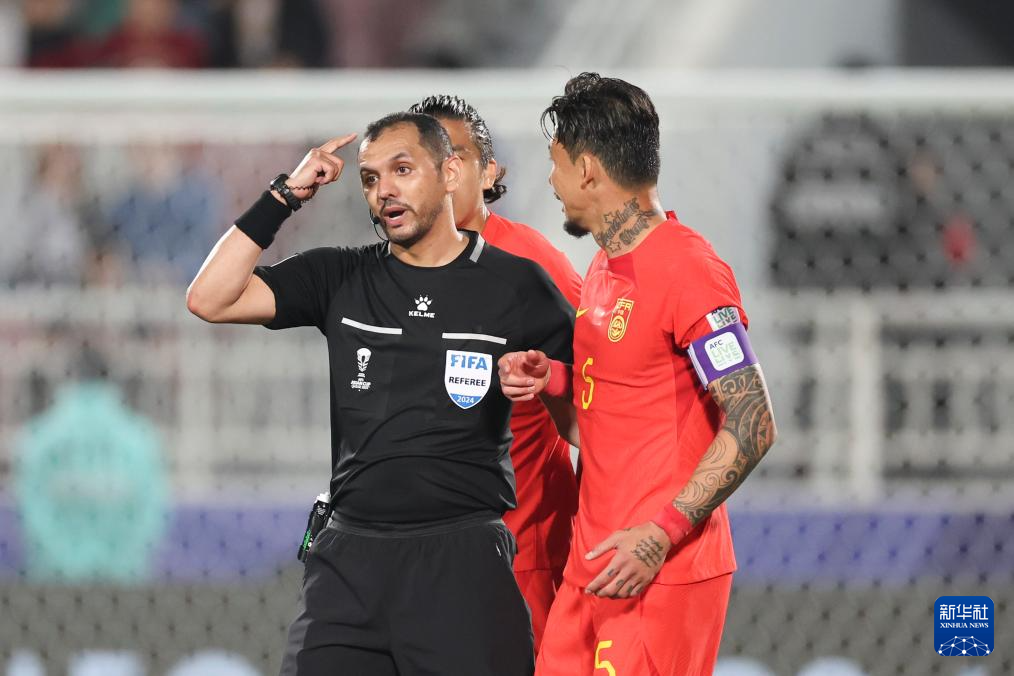 1月13日,中国队球员张琳芃(左二)在队友朱辰杰进球被判无效后与主裁判穆罕默德·哈立德·胡韦什(左三)争论。新华社记者 江汉 摄