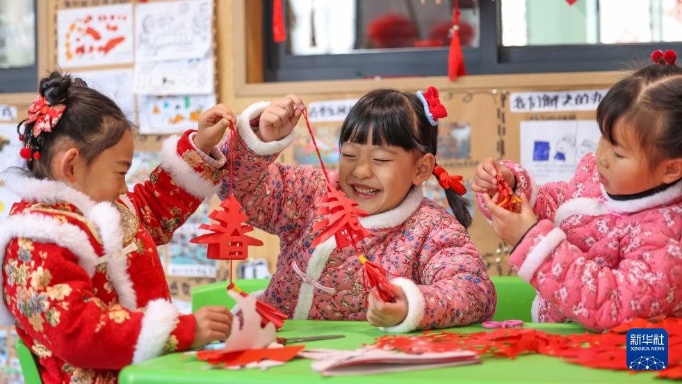 1月16日,贵州省铜仁市玉屏侗族自治县实验幼儿园的小朋友在制作新春主题剪纸作品。新华社发(胡攀学摄)
