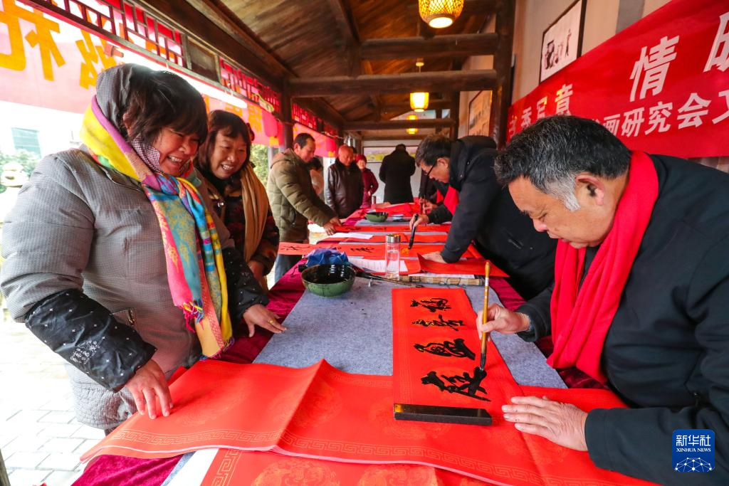 1月16日,书法爱好者在河南省信阳市光山县司马光小镇为群众书写春联。新华社发(谢万柏摄)