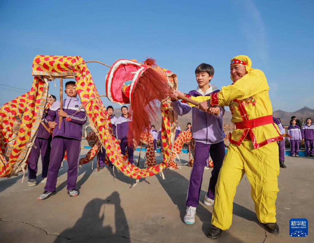 1月16日,在河北省遵化市小厂乡洪山口九年一贯制学校,民间艺人向学生传授舞龙技能。新华社发(刘满仓摄)