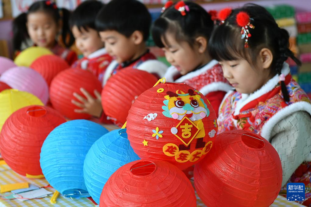1月16日,山东省烟台市福山区清洋街道中心幼儿园的小朋友在制作灯笼。新华社发(孙文潭摄)