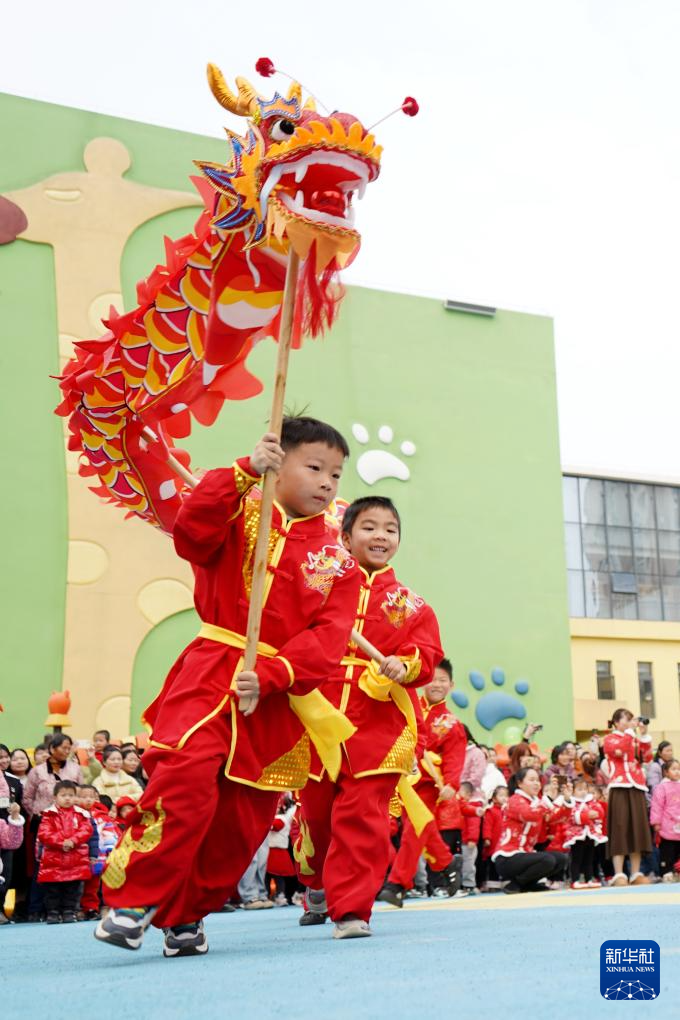 1月16日,江苏省镇江句容市葛村中心小学学生在表演舞龙。新华社发(钟学满摄)