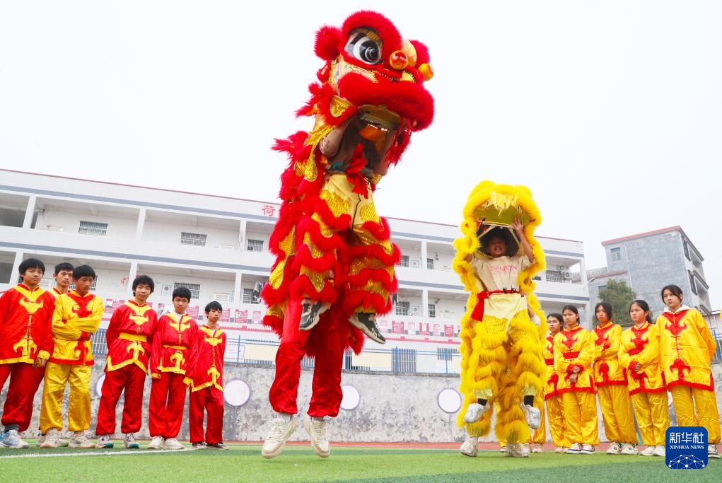 1月15日,湖南省永州市新田县莲花学校学生在老师指导下练习舞狮。新华社发(刘贵雄摄)