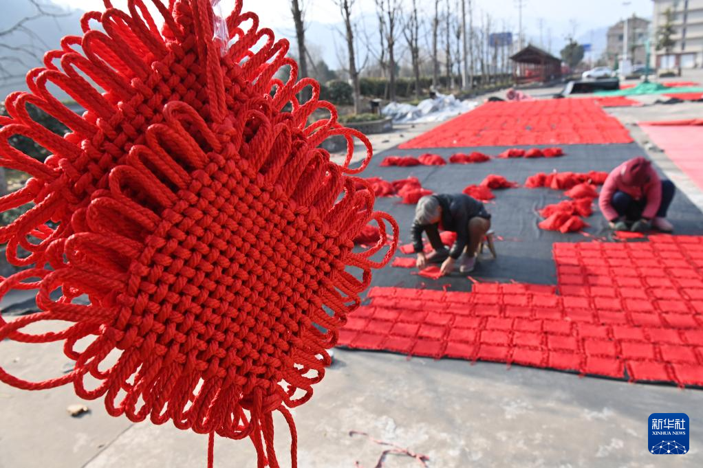 1月16日,浙江省东阳市画水镇画南村村民在晾晒“中国结”。新华社发(包康轩摄)