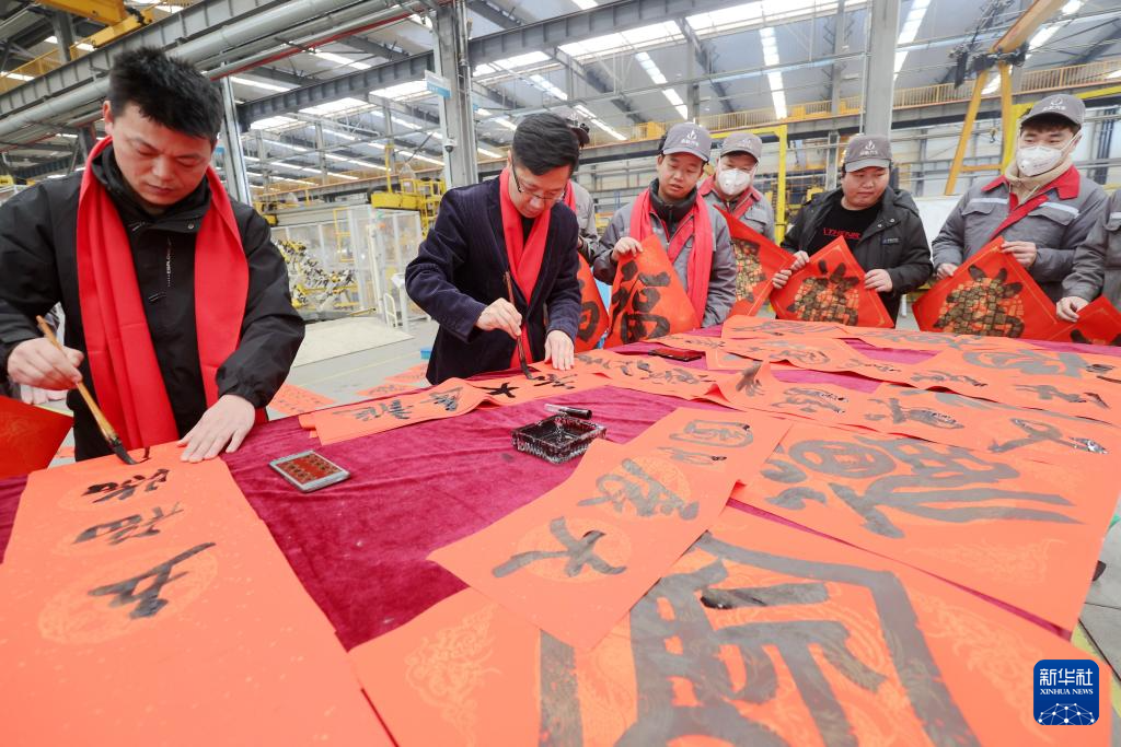 1月16日,在浙江省湖州市莫干山高新区一生产车间,书法家志愿者为一线工人写春联、送“福”字。新华社发(谢尚国摄)