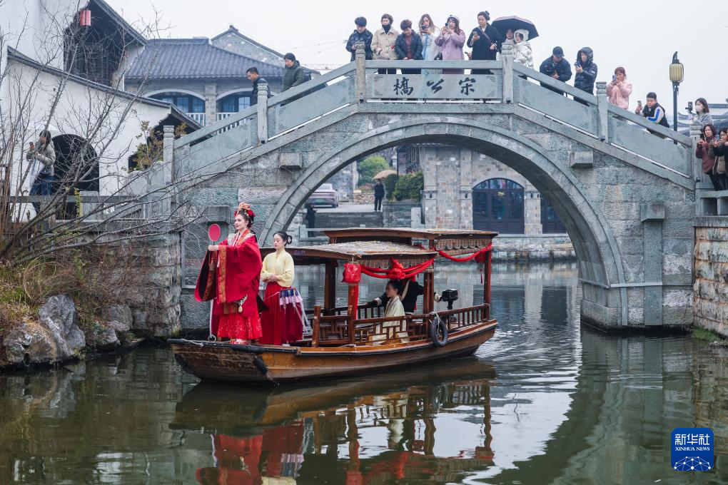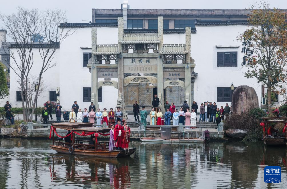 1月18日,中外青年身着传统服饰在建德严州古城的船上体验传统水上婚礼习俗,包括出阁、梳妆、登船、亲迎、礼拜等多个环节。新华社记者 徐昱 摄