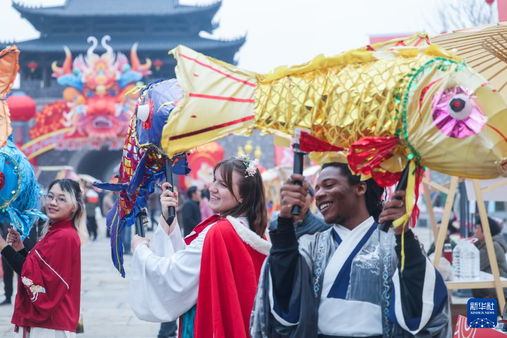 1月18日,中外青年身着传统服饰在建德严州古城宋韵集市上体验传统鱼灯。新华社记者 徐昱 摄