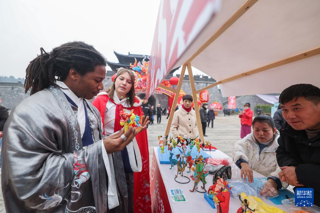 1月18日,中外青年身着传统服饰在建德严州古城宋韵集市上观看传统米塑工艺品。新华社记者 徐昱 摄