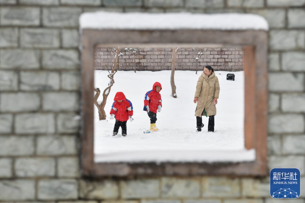 1月22日,家长带领小朋友在贵州省黔东南苗族侗族自治州黄平县行政中心广场玩雪。新华社发(梁文 摄)