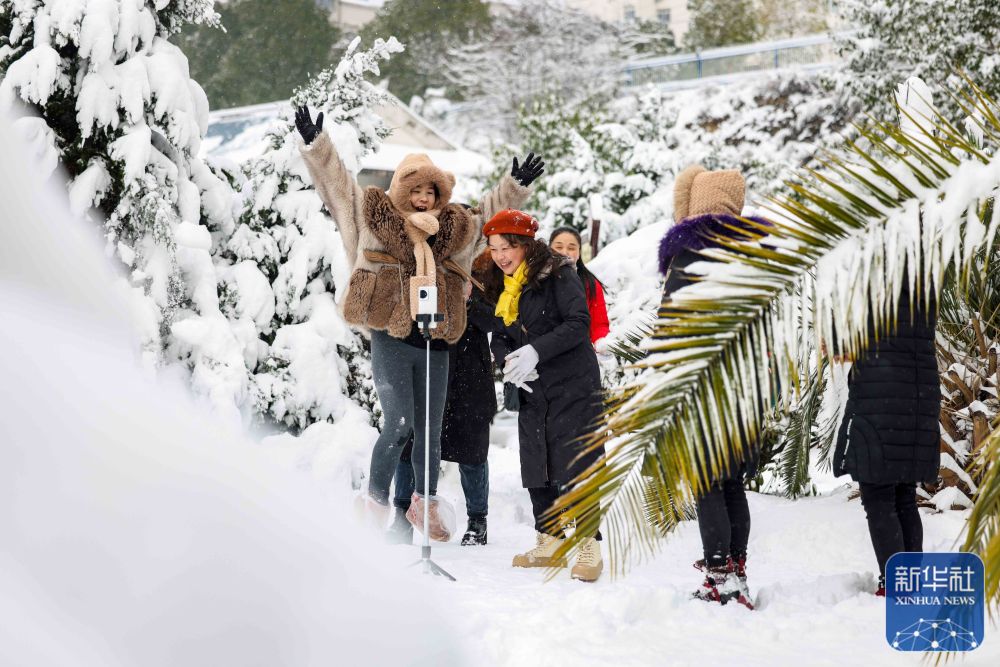1月22日,贵州省黔东南苗族侗族自治州三穗县迎来今年首场降雪,市民在县城广场赏雪拍照。新华社发(龙兴伟 摄)