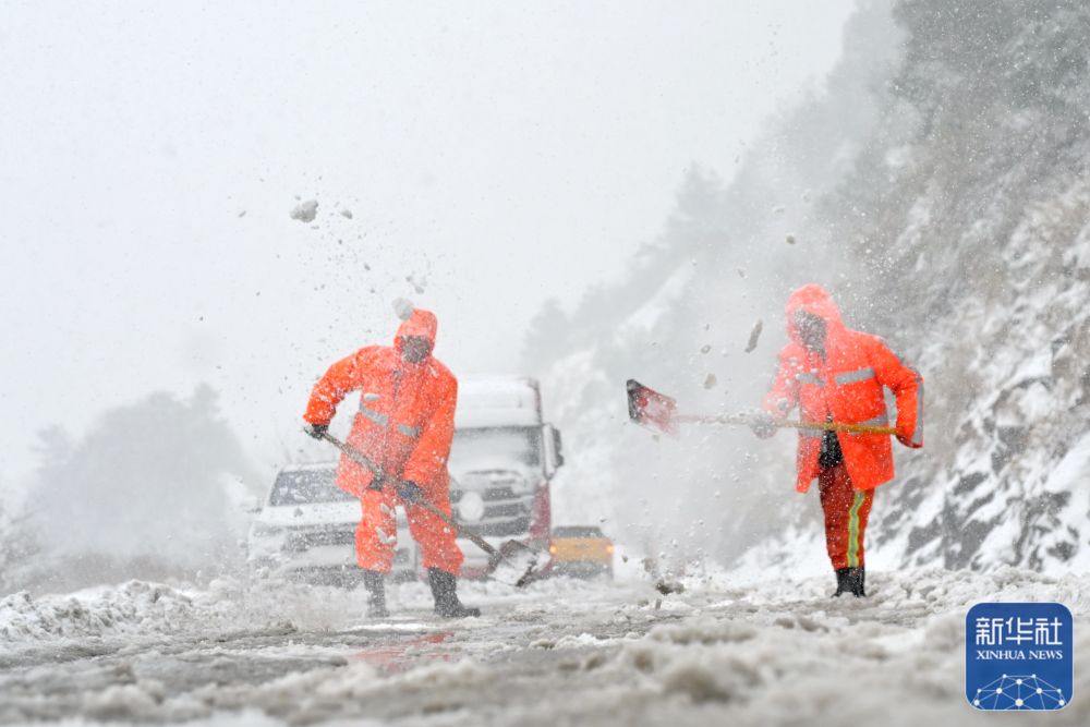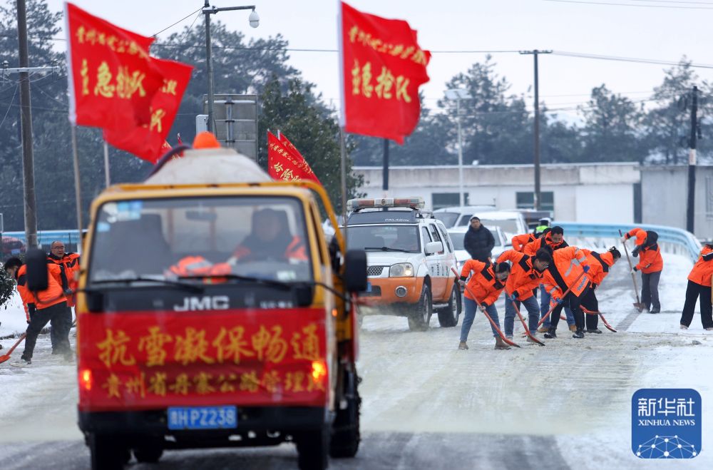 1月22日,在国道321贵州省丹寨县兴仁镇一碗井路段,公路管理部门工作人员在进行除冰除雪作业。新华社发(陆德华 摄)