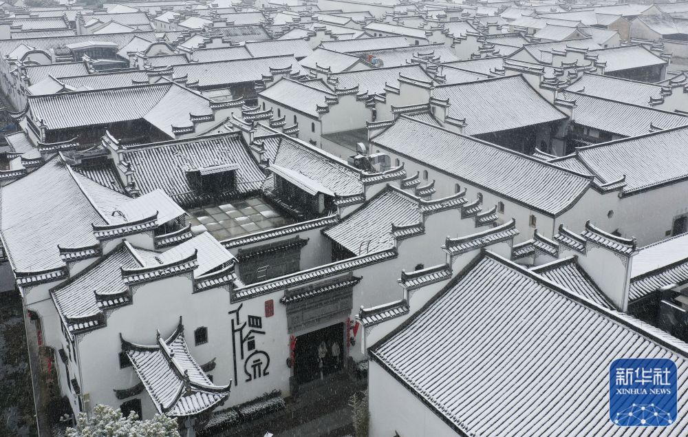 1月22日拍摄的浙江省东阳市卢宅景区雪景(无人机照片)。新华社发(包康轩 摄)