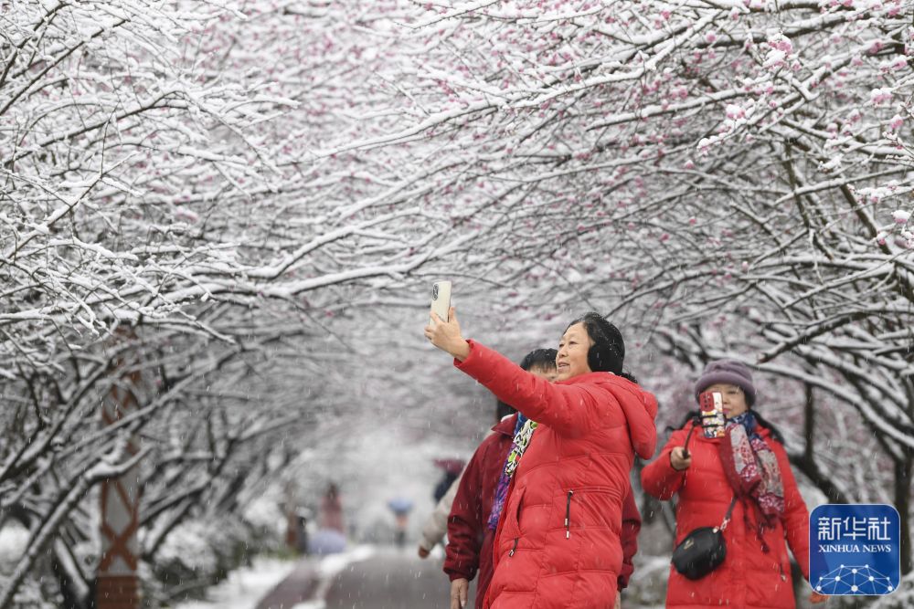 1月22日,在贵州省遵义市余庆县都市第三地生态园,市民在欣赏雪中梅花。新华社发(贺春雨 摄)
