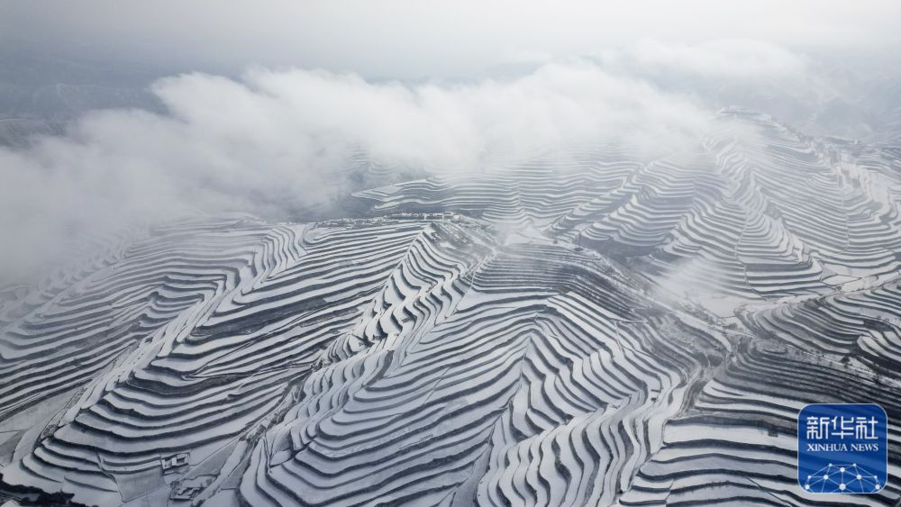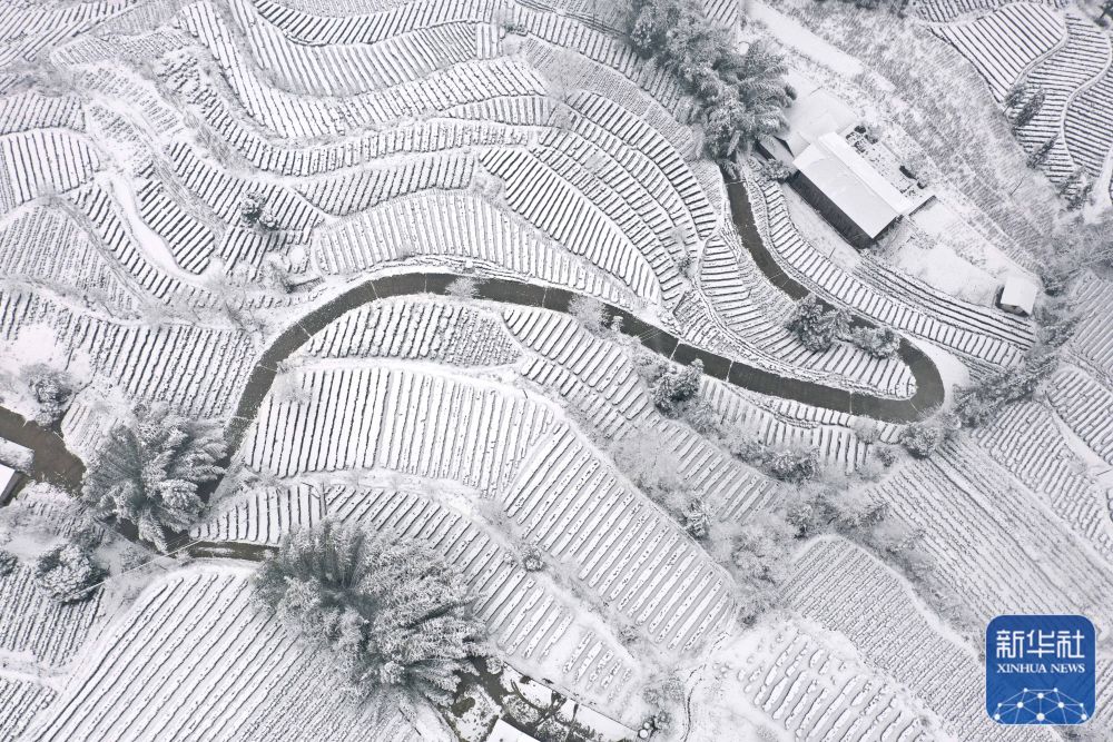 1月22日,湖北省宣恩县境内的茶园梯田被白雪覆盖(无人机照片)。新华社发(宋文 摄)