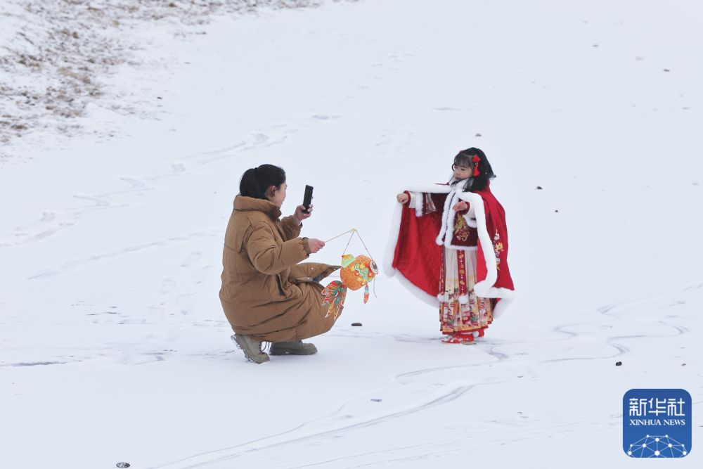 1月21日,市民在甘肃省定西市安定区定西湖公园拍照游玩。新华社发(陈永刚 摄)