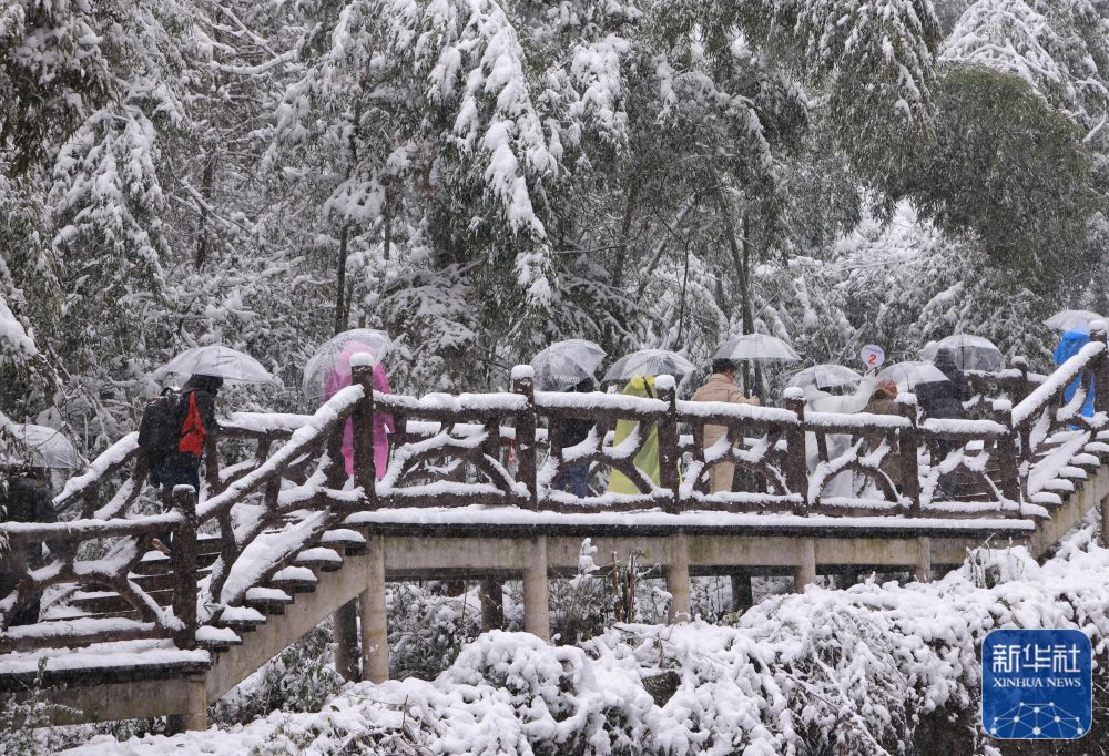 1月22日,游人在张家界市武陵源宝峰湖景区赏雪游玩。新华社发(吴勇兵 摄)