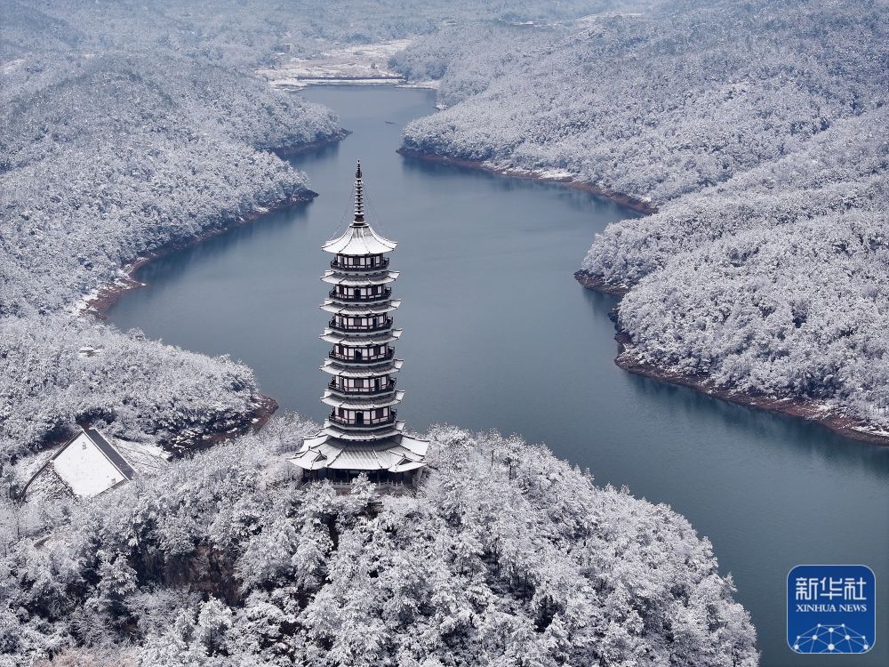 1月22日,浙江省东阳市江北街道浪坑水库边上的群山被白雪覆盖(无人机照片)。新华社发(胡扬辉 摄)
