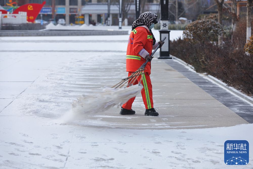 1月21日,环卫工人在甘肃省定西市安定区清扫积雪。新华社发(陈永刚 摄)