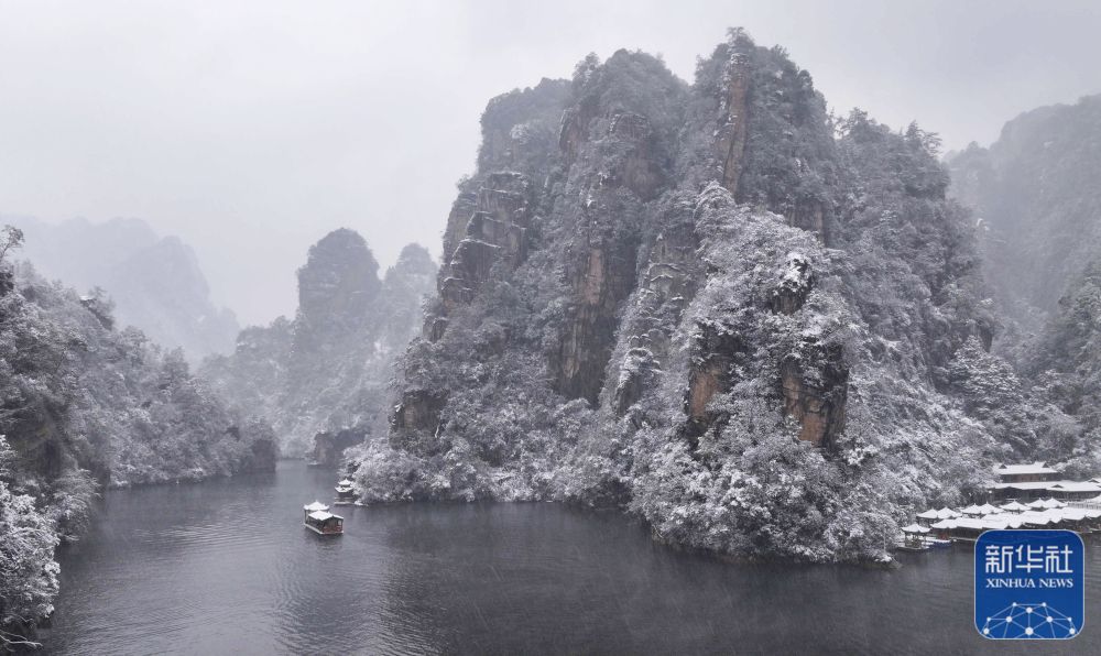 1月22日,游人乘船在张家界市武陵源宝峰湖景区赏雪游玩(无人机照片)。新华社发(吴勇兵 摄)