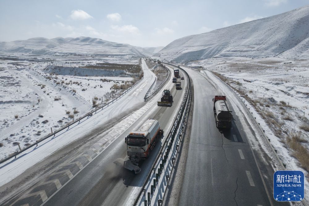 1月21日,甘肃省武威公路事业发展中心除雪车在G2012定武高速营双段开展除雪作业(无人机照片)。新华社发(姜爱平 摄)