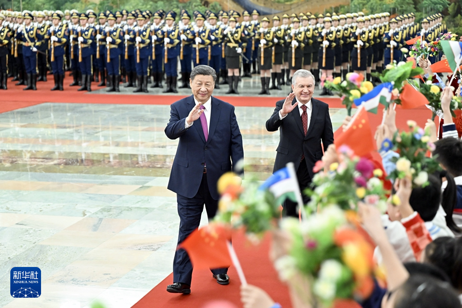 1月24日下午,国家主席习近平在北京人民大会堂同来华进行国事访问的乌兹别克斯坦总统米尔济约耶夫举行会谈。这是会谈前,习近平在人民大会堂北大厅为米尔济约耶夫举行欢迎仪式。新华社记者 殷博古 摄