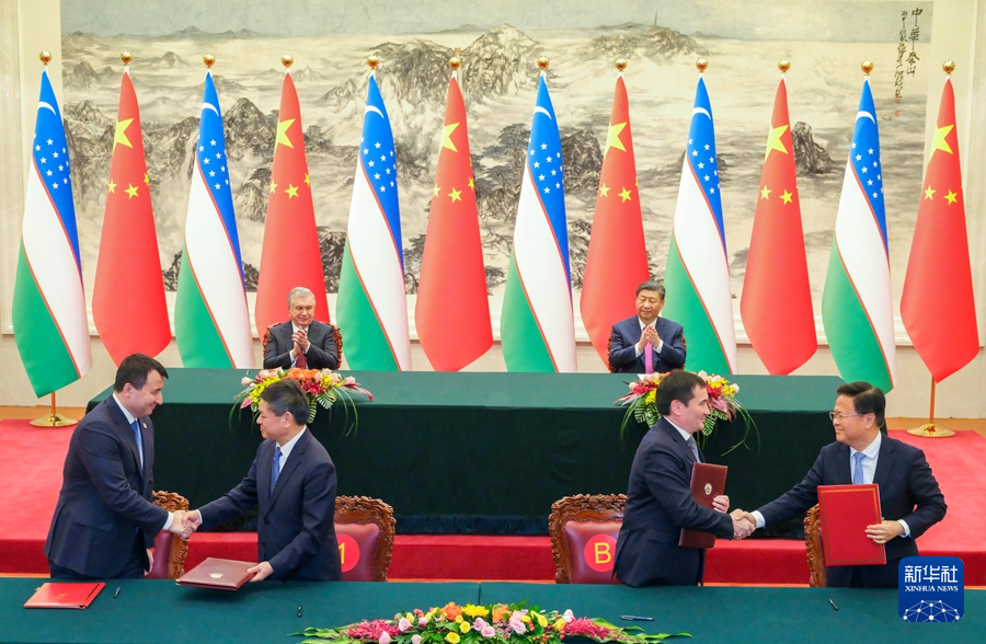 1月24日下午,国家主席习近平在北京人民大会堂同来华进行国事访问的乌兹别克斯坦总统米尔济约耶夫举行会谈。这是会谈后,两国元首共同见证签署一系列合作文件。新华社记者 丁林 摄