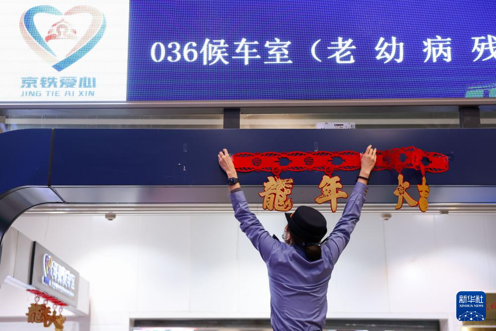 1月26日,在北京西站候车室,工作人员悬挂“龙年大吉”装饰。新华社记者 鞠焕宗 摄