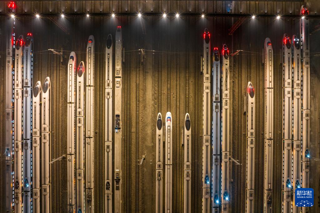 1月26日凌晨,完成检修的动车组列车停靠在昆明动车所内,整装待发(无人机照片)。新华社发(张正举摄)