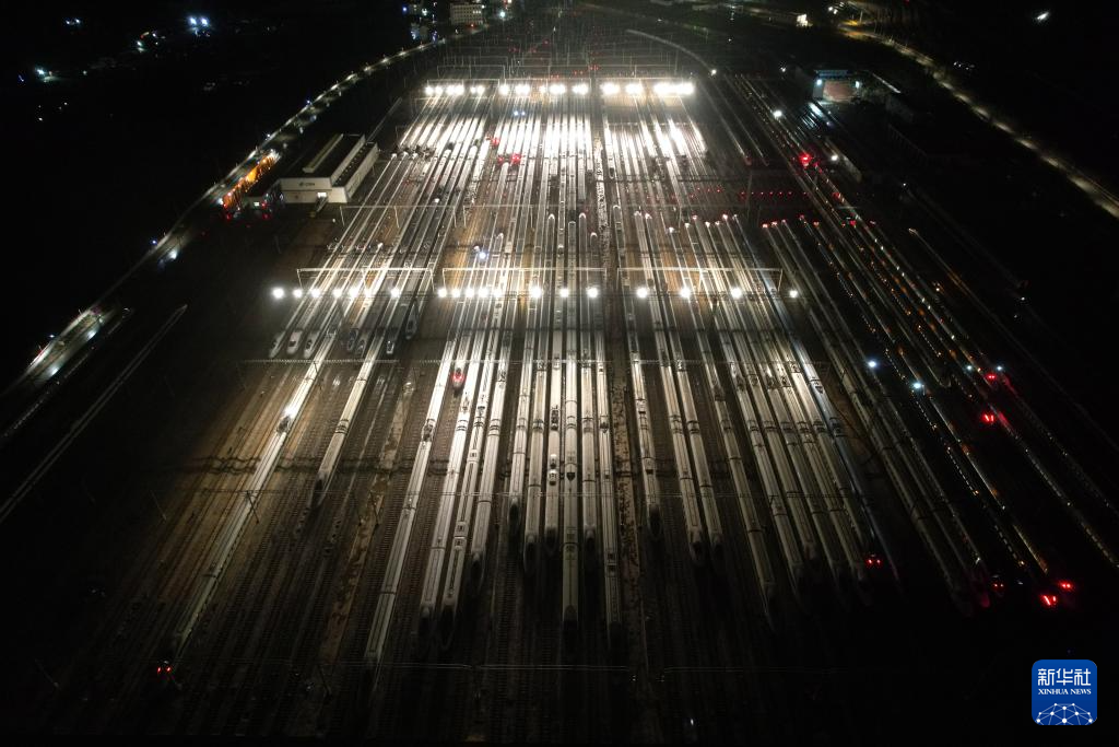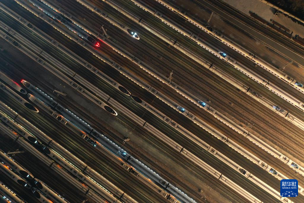 1月26日凌晨,动车组列车停靠在南京动车段南京南动车运用所存车线上(无人机照片)。新华社发(方东旭摄)