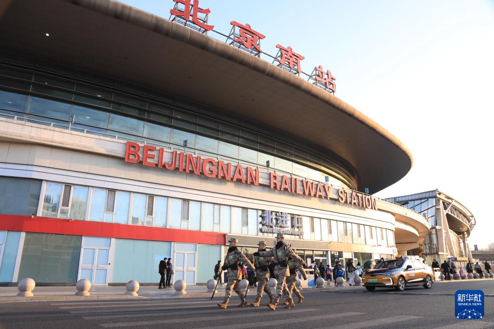 1月26日,在北京南站,武警北京总队某支队官兵执勤巡逻。新华社发(徐锦科摄)