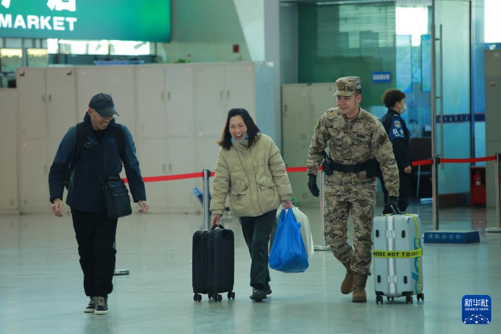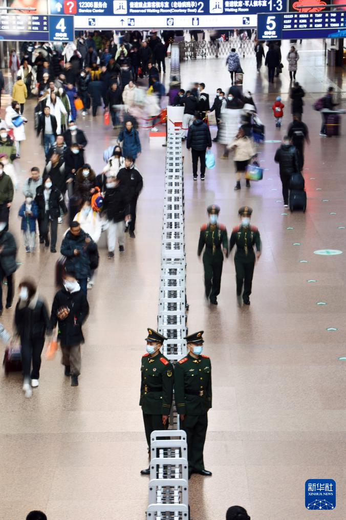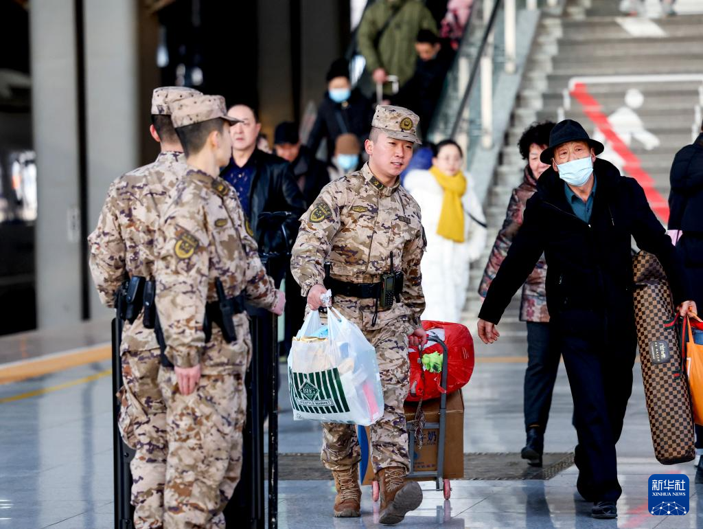 1月27日,在西宁火车站,武警青海总队西宁支队官兵为旅客提供帮助。新华社发(郭紫阳摄)