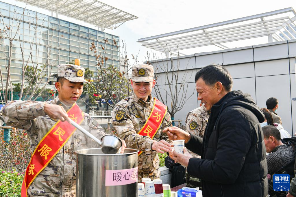 1月26日,在上海火车站,武警上海总队某支队官兵设立便民服务点,为旅客提供暖心姜茶。新华社发(王新桐摄)