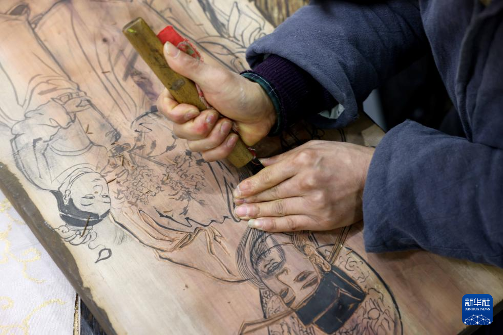 2月4日,在童寿记木版年画工作室,非遗传承人童敏在进行年画刻版。新华社发(解琛摄)