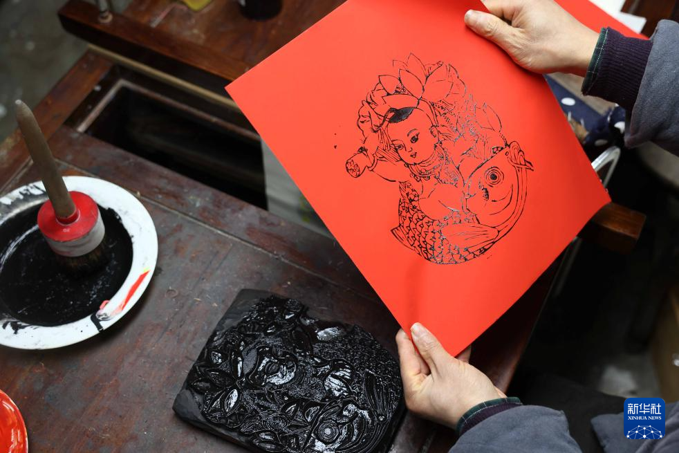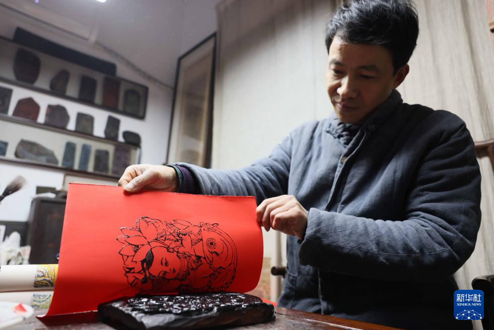 2月4日,在童寿记木版年画工作室,非遗传承人童敏在印制年画。新华社发(解琛摄)