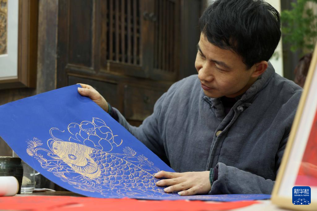 2月4日,在童寿记木版年画工作室,非遗传承人童敏在进行年画创作。新华社发(解琛摄)