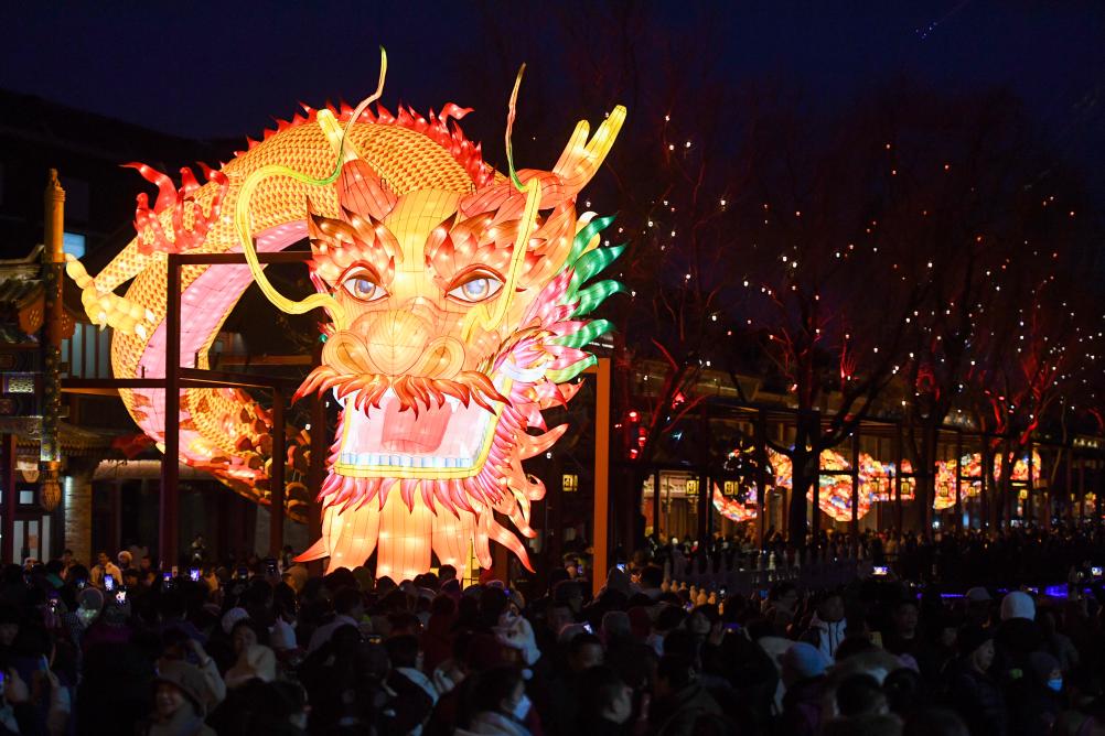 春节期间,北京什刹海荷花市场热闹非凡。202.4米长、名为“蛟龙出海”的巨型龙灯绕湖盘旋,吸引了大量游客观赏拍照。金红色的龙头长须飞扬,栩栩如生。逛集市、看湖景,游人们在热闹欢腾中体验年味。