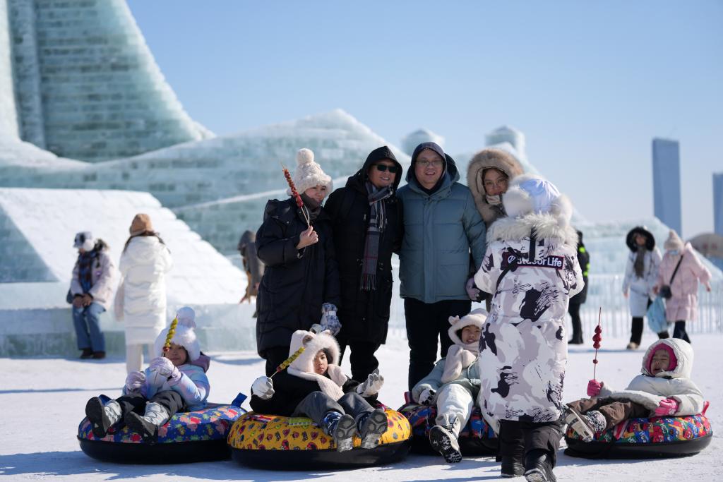 2月15日,游客在哈尔滨冰雪大世界园区内留影。新华社记者 王建威 摄