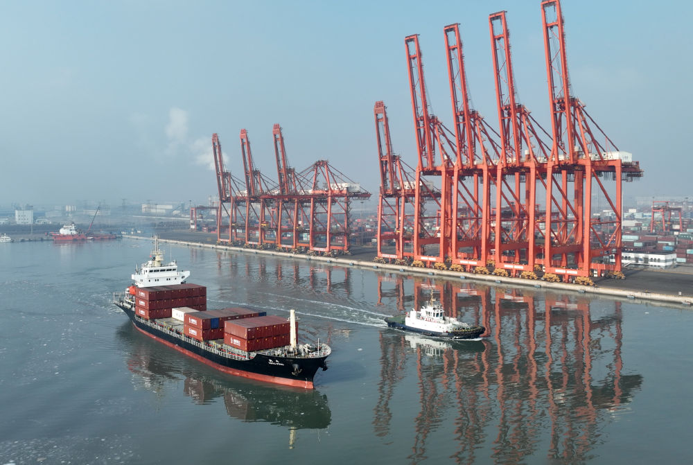 2024年2月7日,一艘轮船在唐山港京唐港区集装箱码头装完货物后离港(无人机照片)。新华社记者 杨世尧 摄