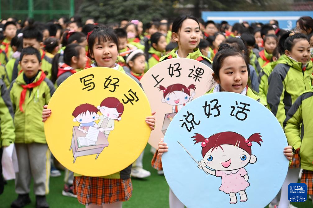 2月26日,西安市未央区方新小学的学生在开学典礼上。新华社记者 邹竞一 摄
