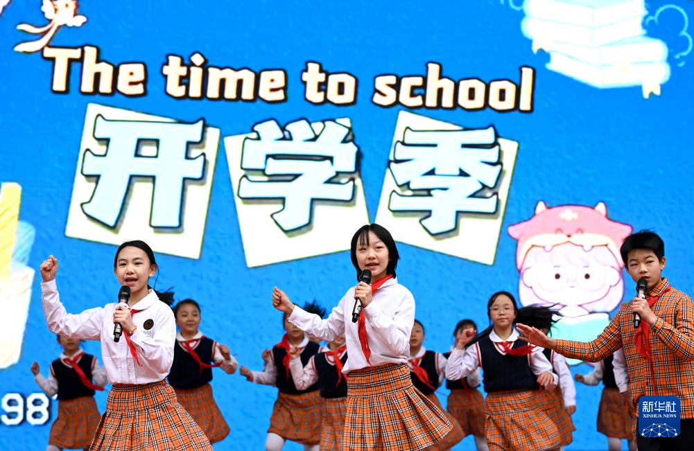 2月26日,西安市未央区方新小学的学生在开学典礼上表演舞蹈。新华社记者 邹竞一 摄