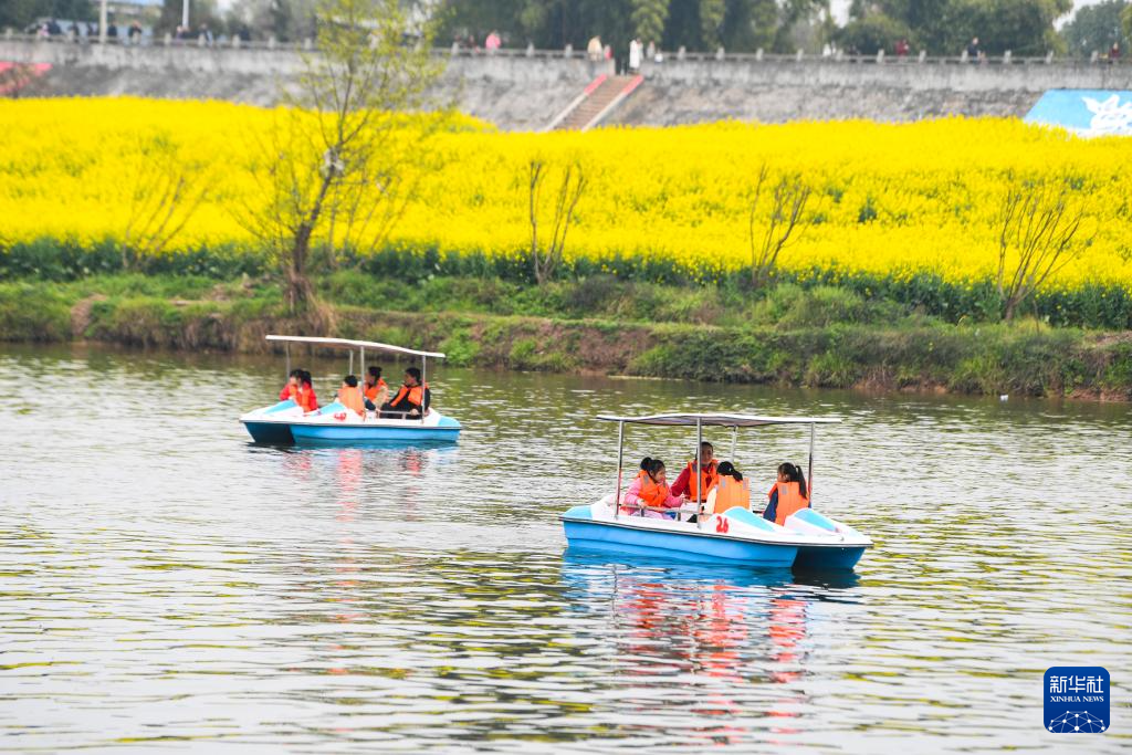 3月9日,游客乘坐游船在重庆潼南崇龛花海景区游览。新华社记者 王全超 摄