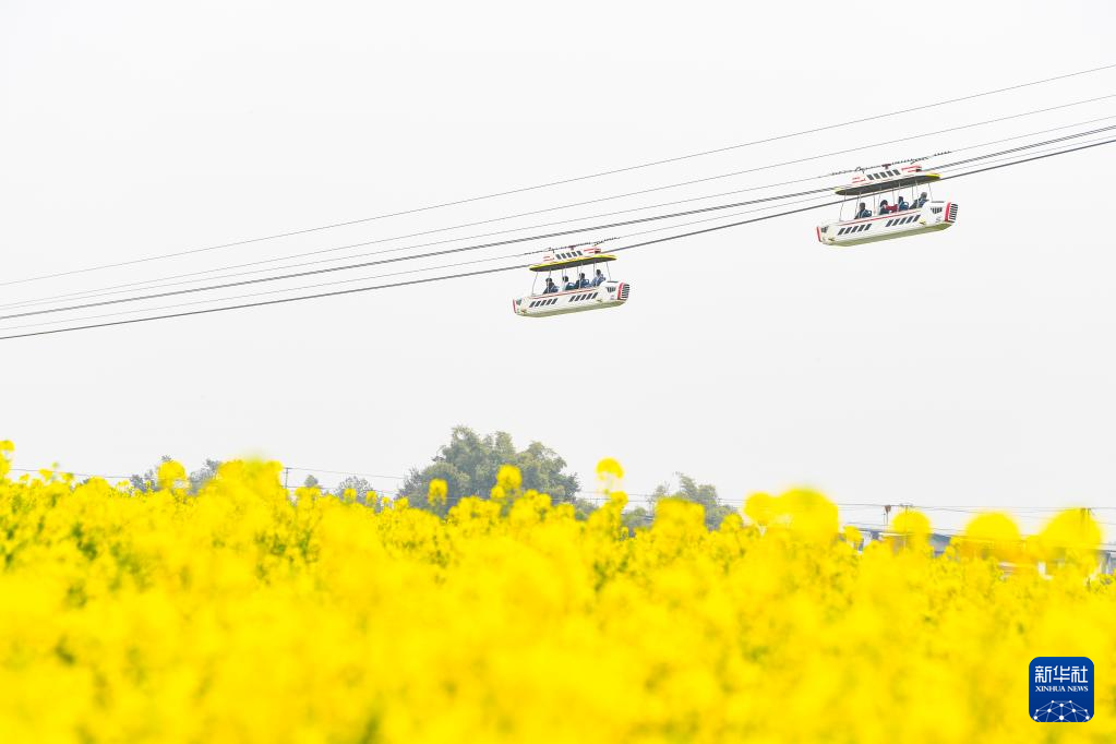 3月9日,游客乘坐观光缆车在重庆潼南崇龛花海景区游览。新华社记者 王全超 摄